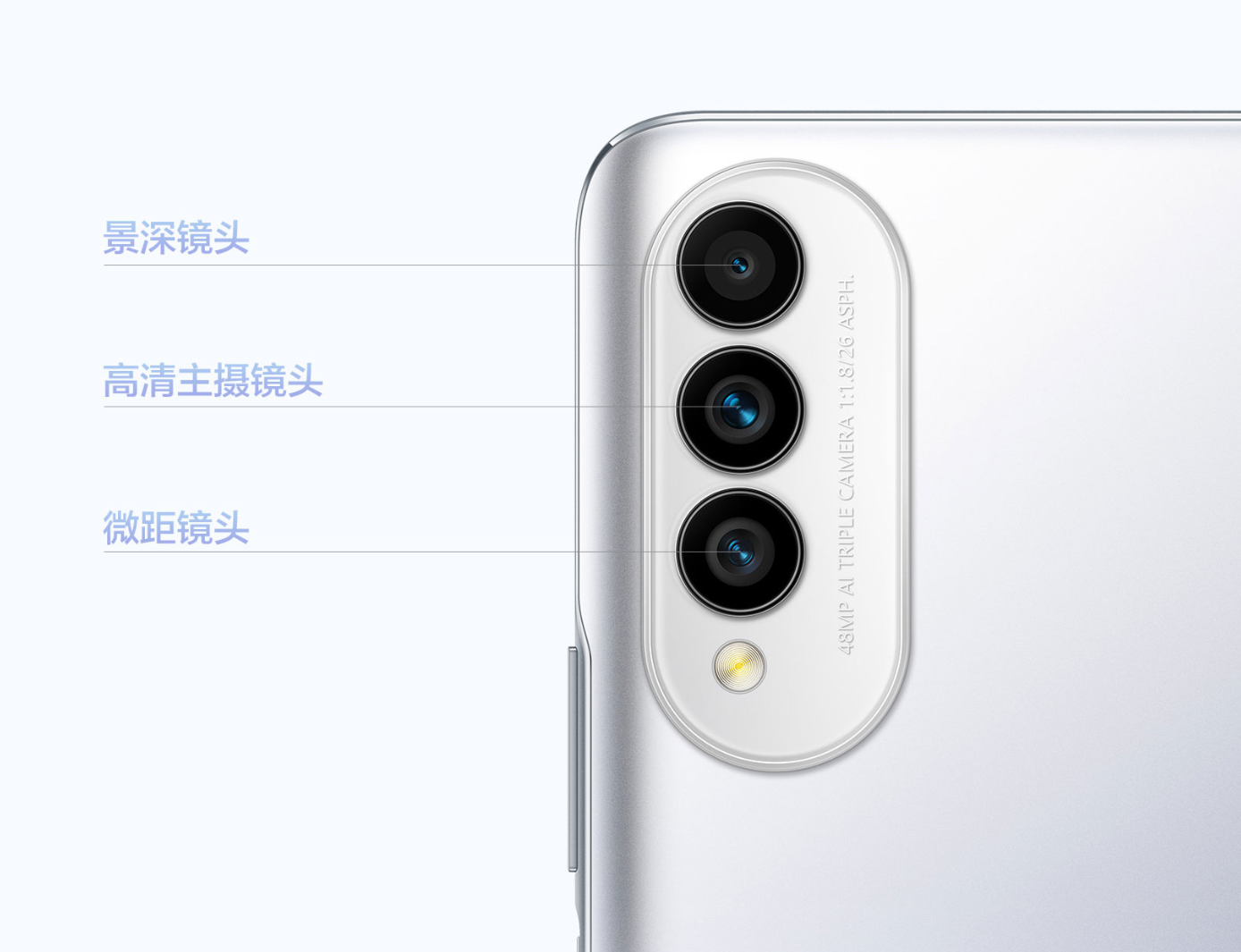 后置三摄,包括4800万像素主镜头、200万像素微距镜头(F2.4)、200万像素景深镜头(F2.4),支持1080p视频录制,前置自拍则是1600万像素。