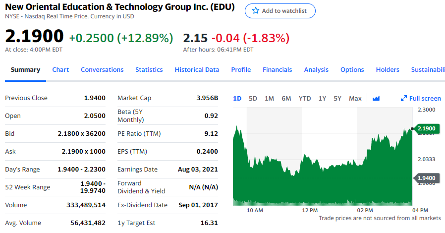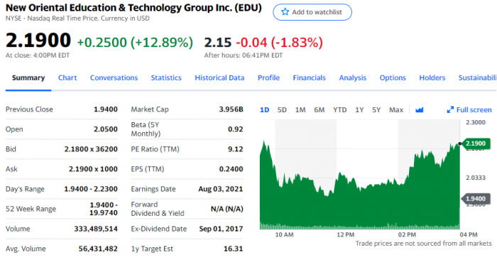 在此前的两个交易日中,新东方股价累计下跌近70%,由6.4美元暴跌至1.94美元。