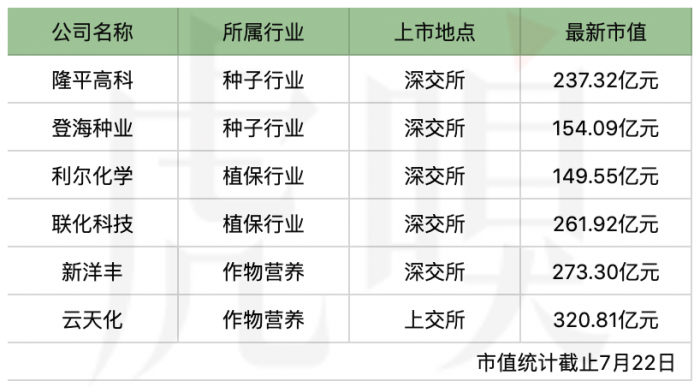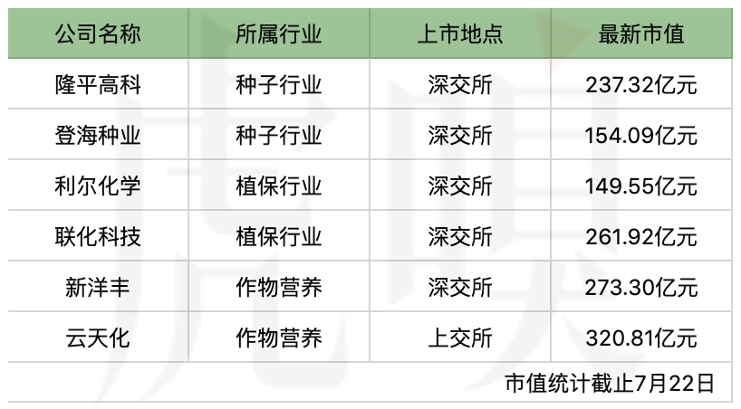 从国内来看,种子行业的主要公司包括隆平高科和登海种业等,植物保护产品行业的主要公司包括利尔化学和联化科技等,作物营养产品行业的主要公司包括新洋丰、云天化等。