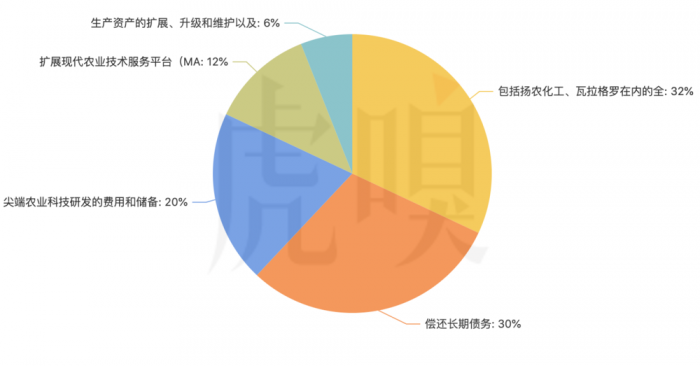招股书披露,其募资金额主要用在五个方面,分别为:包括扬农化工、瓦拉格罗在内的全球并购项目;偿还长期债务;尖端农业科技研发的费用和储备;扩展现代农业技术服务平台(MAP);生产资产的扩展、升级和维护以及其他资本支出。具体比例如下图: