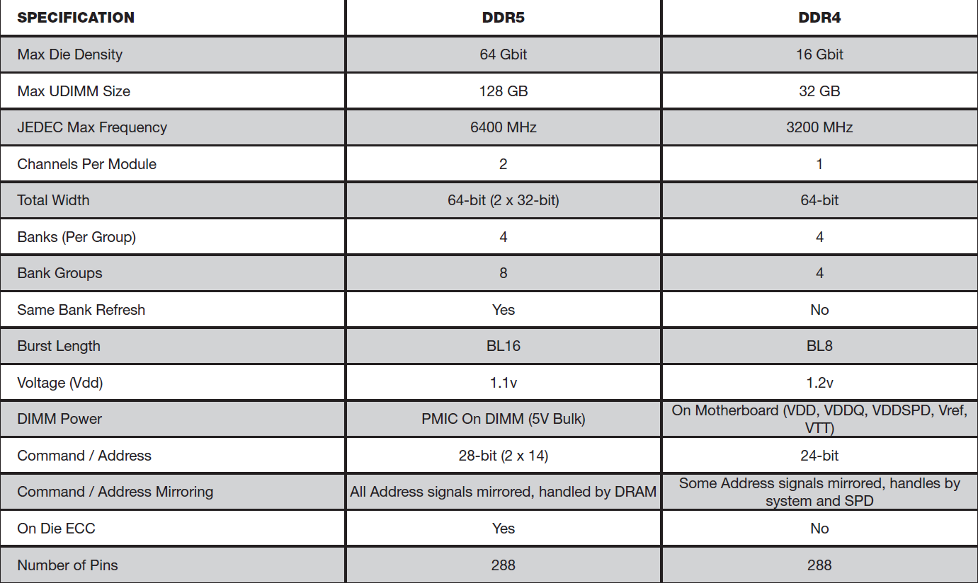 与 DDR4 内存相比,DDR5 将带宽轻松提升了一倍以上。回想从 DDR3 到 DDR4 的 2013 年,初期的内存带宽仅增加了 33%(1600 MHz 到 2133 MHz)。