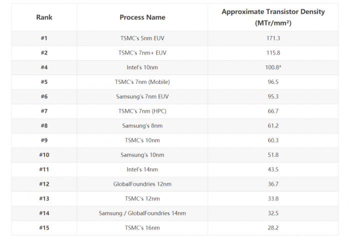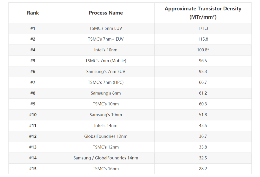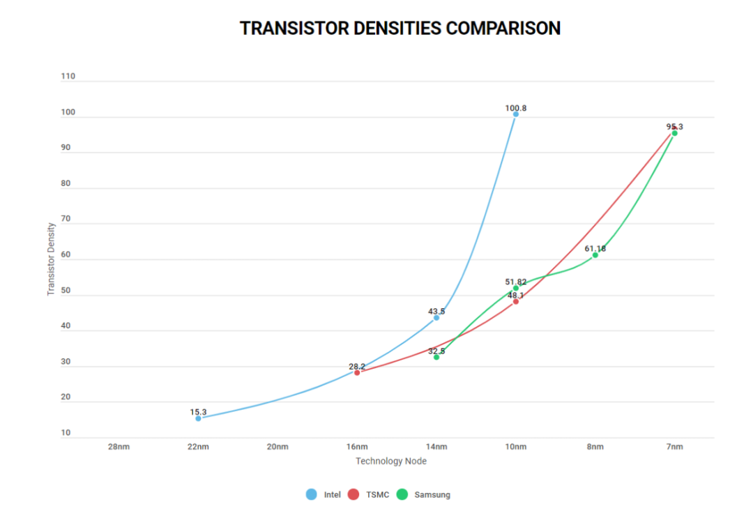 为了更好的对比不同厂商间的芯片制程工艺,我们可以抛开表面的芯片命名方式,用芯片晶体管密度数据来一探究竟。