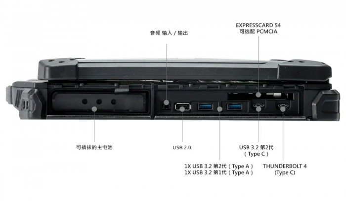 在接口方面,这是一台提供不同接口类型的智能设备,其中配备各类可选择的附加组件,包括 Thunderbolt ™ 4、2 个 RJ-45 端口 、2 个 RS-232 串行端口 、ExpressCard 54 或 PCMCIA 类型 II 插槽。此外 ,USB 选项还提供 Type-C 到 Type-A, 或 USB 3.2 第 2 代 到 USB 2.0 的所有功能。