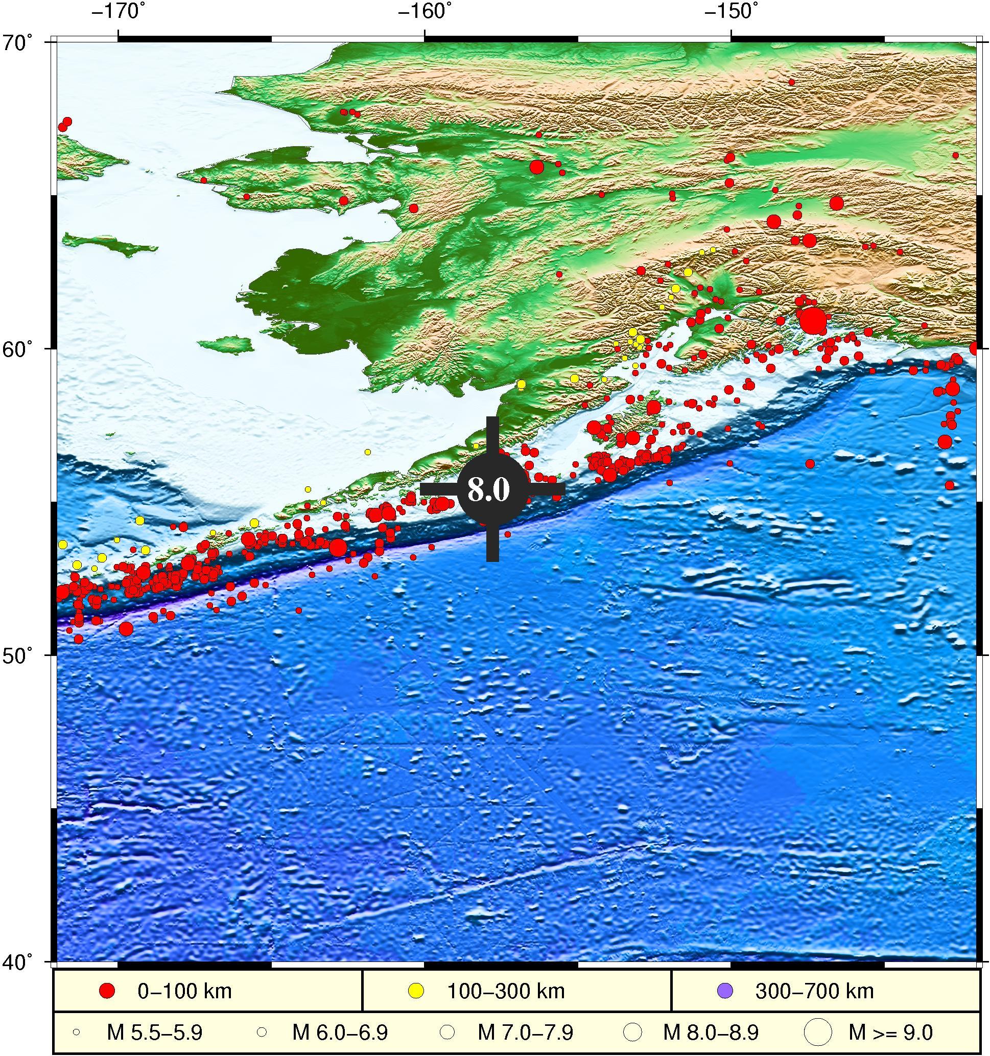 据中国地震台网正式测定,北京时间7月29日14时15分(当地时间7月28日19时15分)在美国阿拉斯加州以南海域发生8.1级地震,震源深度10千米,震中位于北纬55.40度,西经158.00度。测定中还显示,震中5公里范围内平均海拔约-90米。