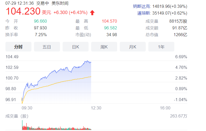 在“苏妈”的领导下,AMD这几年无论产品还是市场都芝麻开花节节高,股价同样一路飙升。美国东部时间7月29日,美股开盘后,AMD股价一路走高,很快就历史性地突破了100美元大关,目前还在继续上涨。