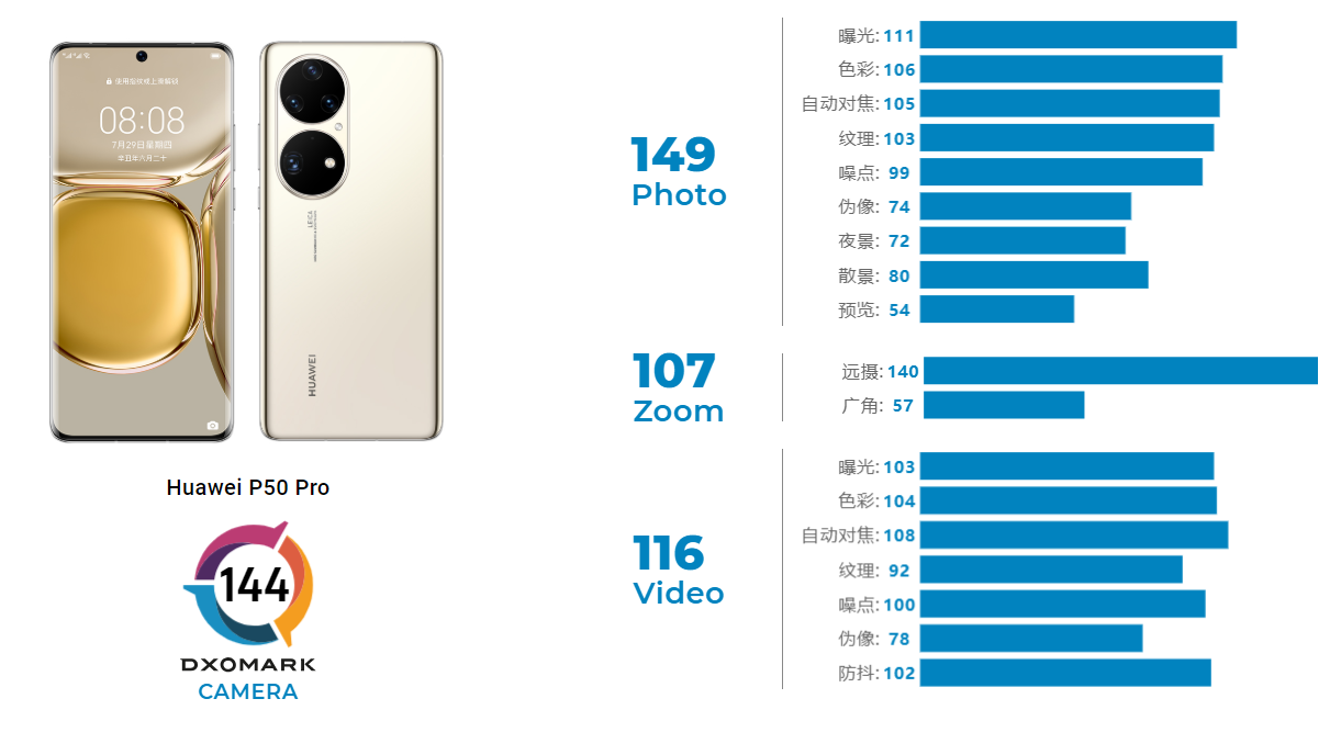 华为刚刚发布的新旗舰P50 Pro,DxOMark评测成绩已经出炉,总分高达144分,以一分优势力压小米11 Ultra,重回世界第一,DxOMark称其为“所有领域的翘楚”。其中,拍照子项成绩149分,领先小米11 Ultra 1分,变焦子项成绩107分,领先小米10至尊版多达6分,视频子项成绩116分,落后小米11 Ultra 1分。
