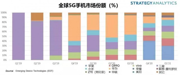 市场研究机构Strategy Analytics发布的研究报告显示,2021年Q1,中国厂商OPPO、vivo、小米5G智能手机销售额达到150亿美元,仅这三家供应商的5G收益就几乎是同期LTE手机收益的两倍。