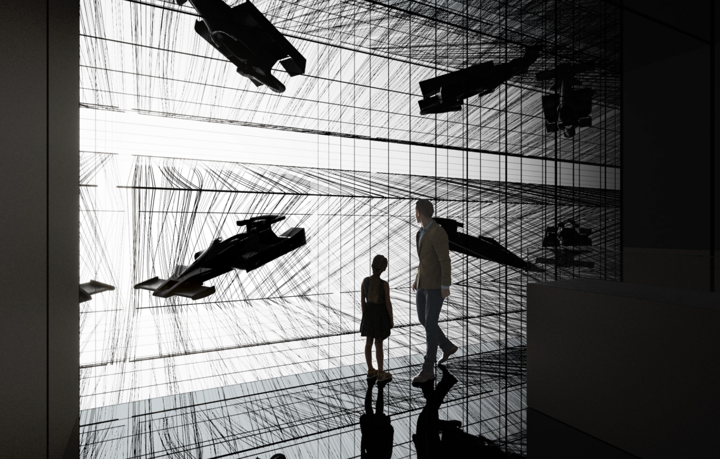 之后,参观者穿过一条长长的走廊,他们可以观察丙烯酸纤维转化为碳纤维的过程。接下来是博物馆的第二部分,专门介绍纤维在当代工业中的应用。在一个由沉浸式装置充实的黑色房间内,一组互动文物探索了碳纤维的实验性应用,并展示了汽车制造和航空航天公司用碳纤维制作的最具创新性的原型。