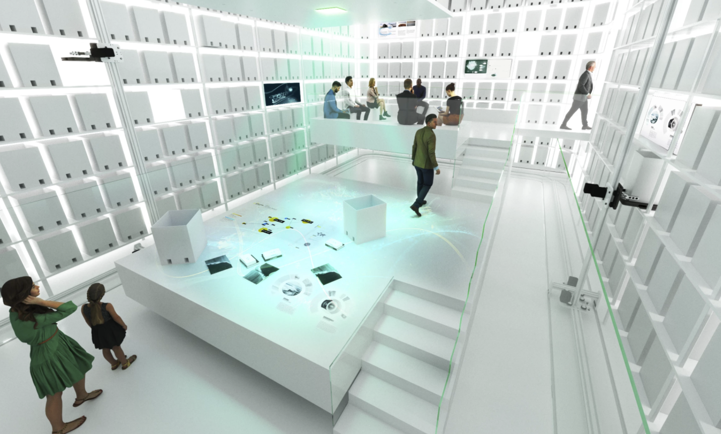 在博物馆的第一部分,参观者会遇到一个机器人档案仓库,用耀眼的白光照亮,里面装满了MAE的历史文件,一系列机械臂沿着墙壁移动,从品牌50年的历史中提取照片、技术档案和宣传活动相关物品,并将这些物品带到一个升高的中央平台上,游客可以坐在那里浏览它们。