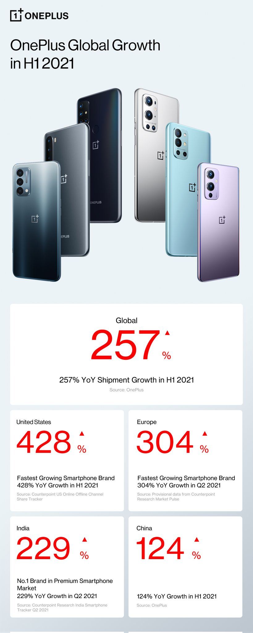 与此同时,在欧洲,一加出货量同比增长 301%。 在印度 ,Counterpoint Research 的数据显示,在 21 年第 2 季度,该公司占据了高端智能手机市场 48% 的市场份额。最后,在 OnePlus 仅销售 9 系列的中国,今年上半年的出货量同比增长了 124%。所有这些对于一加来说确实是个好消息。即使在非常困难的美国市场,该公司的发展也非常迅速。