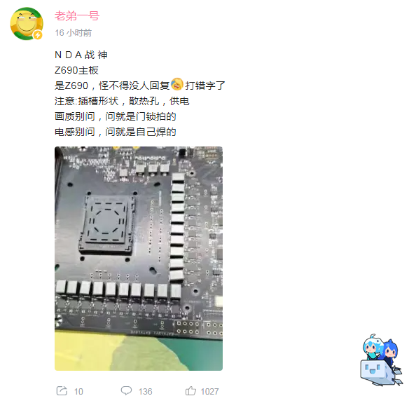 昨日,B 站知名 UP 主 @老弟一号 分享了一张高端 Z690 主板的谍照,可见英特尔为 Alder Lake CPU 换用的 LGA 1700 插槽、双 8-pin 辅助供电,以及高达 20 相的 VRM 供电设计。不过由于缺少散热片等覆盖件,我们无法确定这款主板的确切身份。