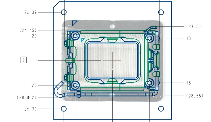 由于 Alder Lake CPU 从方形变成了长方形(37.5 × 45.0 mm 封装),主板插槽和散热器扣具也必须同时做出调整(从 75 × 75 mm 改为 78 × 78 mm)。