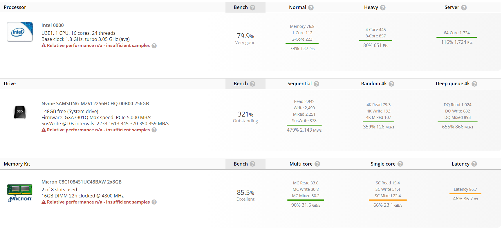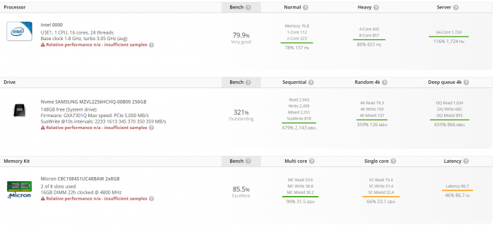 UserBenchmark还给出了它的实测成绩,单核心112分,非常之低,多核心1724,已经非常接近8核心16线程的i9-11900K。