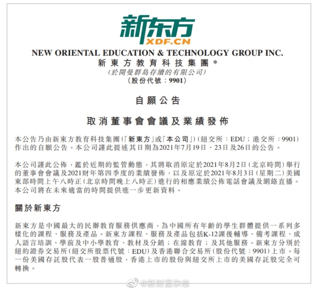 前不久,国内公布了堪称史上最严格的监管政策,要求减轻义务教育阶段学生负担,导致校外培训机构巨大震动,上市公司股价暴跌,市值损失上千亿,新东方一度暴跌70%。据港交所文件,新东方港股昨晚发布公告称,鉴于近期的监管动态,取消原定于今日举行的董事会会议及2021财年第4季的业绩发布,以及北京时间8月3日晚上8点进行的相应业绩公布电话会议及网络直播 。