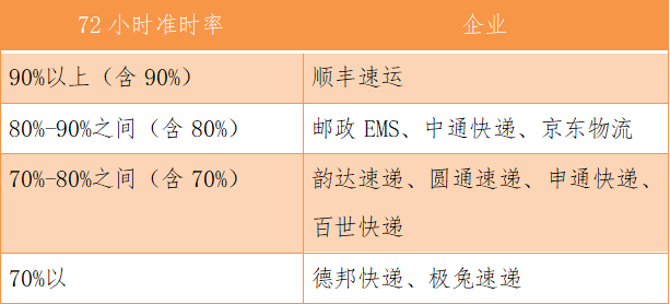 在72小时准时率方面,准时率在90%以上(含90%)的企业为顺丰速运;准时率在80%-90%之间(含80%)的企业为邮政EMS、中通快递、京东物流;