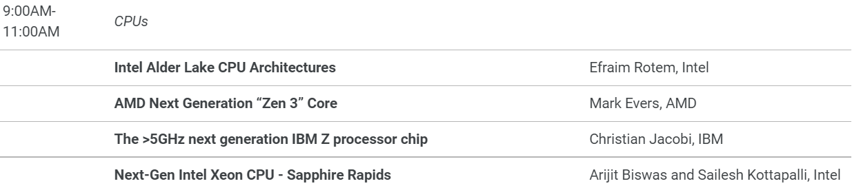 第二天则是“架构日”,Intel Alder Lake 12代酷睿/Sapphire Rapids下代至强、AMD Zen3、IBM Z 5GHz+竞相秀技。