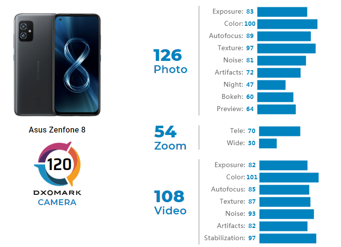 两款产品的 DxOMark 得分也类似,Zenfone 8 的总分为 120 ,但 iPhone 12 mini 以 122 分略微胜出。