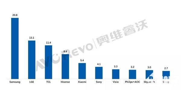 2~10分别是LG、TCL、海信、小米、索尼、vizio、飞利浦+AOC、创维以及夏普,其中TCL出货1140万台,同比增长13.6%;海信出货840万台,同比增长5.5%;小米出货540万台。