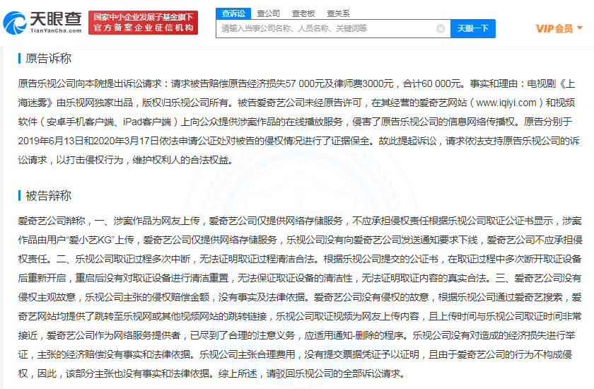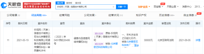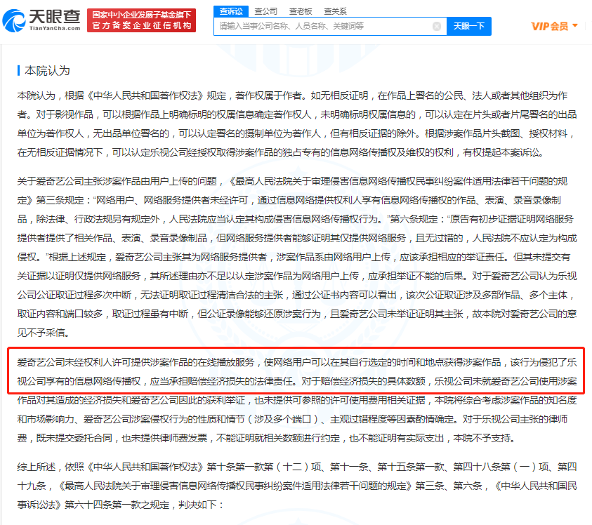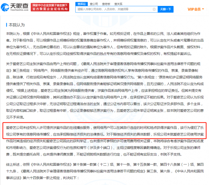 天眼查 App 显示 ,8 月 5 日,乐视网(天津)信息技术有限公司与北京爱奇艺科技有限公司侵害作品信息网络传播权纠纷多个一审民事判决书公开。 法院认为,爱奇艺公司的行为侵犯了乐视公司享有的信息网络传播权,应当承担赔偿经济损失的法律责任。最终判决结果为,被告北京爱奇艺科技有限公司赔偿原告乐视网(天津)信息技术有限公司经济损失总计 28 万元。