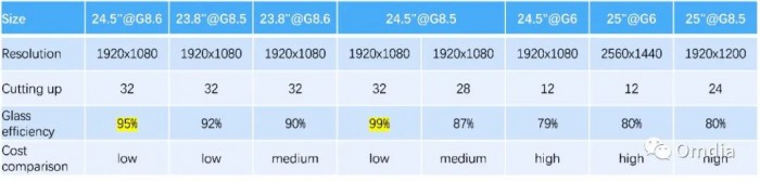 若考虑切割效率,24.5寸在8.6代线具有高达约95%的切割效率,甚至较8.5代线上92%切割效率的23.8寸更高,在几种相似尺寸的面板产品的类似切割中,非常具有竞争力。