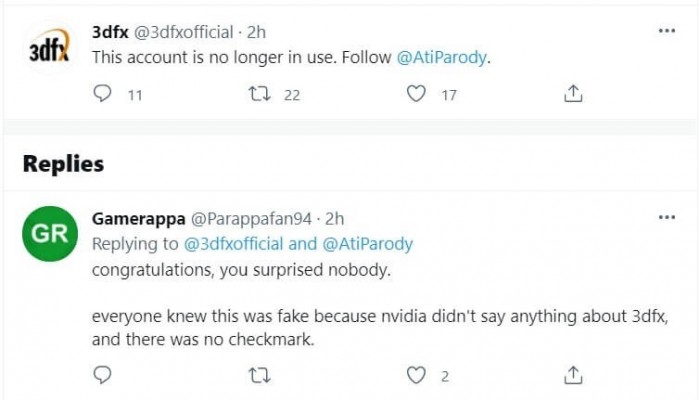 两周前,某Twitter账户浮出水面,暗示原知名显卡厂商3DFX Interactive将回归。而根据现在的信息来看,这只是一个纯粹的恶搞。根据这个恶搞账号公布的信息,Jansen Products在7月中旬收购了3DFX的资产。从这个名字来看其实已经能发现端倪了,Nvidia的CEO黄仁勋英文名就是JensenHuang。