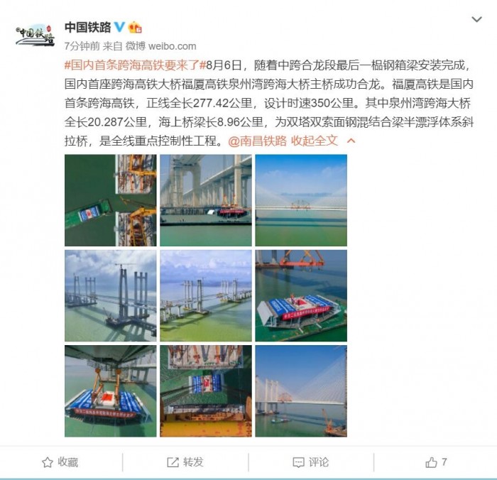 8月7日消息,中国铁路官方微博宣布,由中国铁建铁四院设计的新建福(州)厦(门)高铁泉州湾跨海大桥6日成功合龙,这标志着国内首条跨海高铁福厦高铁全线的关键控制性节点打通,中国高铁即将迈入跨海时代。