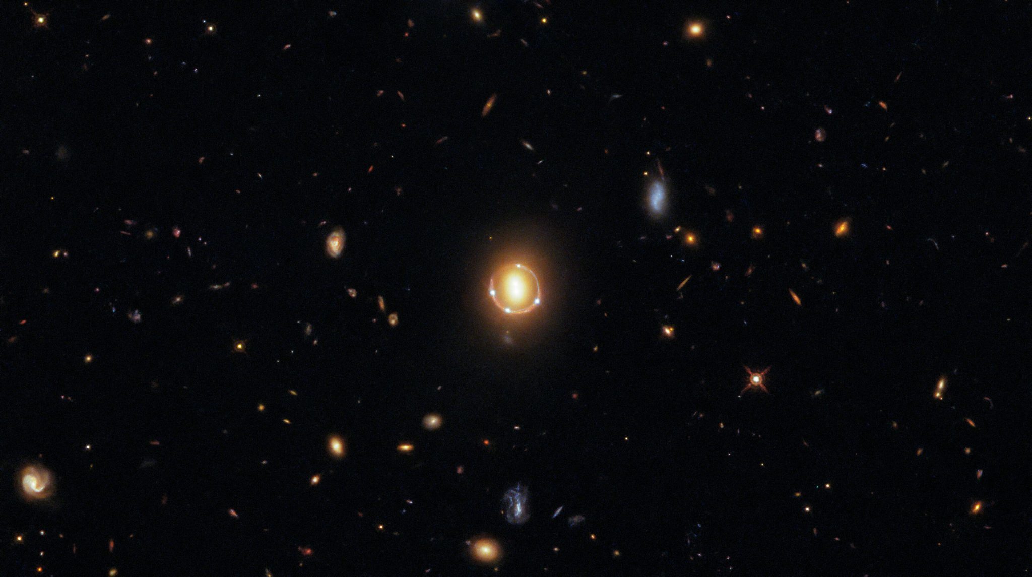 另外,哈勃望远镜的数据还表明,在这颗遥远的类星体的正中央有第7个光点,这是一张遥远类星体的罕见的第5张图。这一罕见的现象是由前景中两个充当透镜的星系引起。