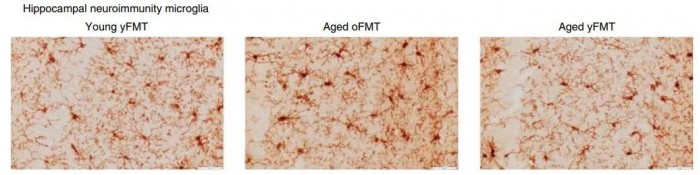 ▲海马体内的小胶质细胞,形态随衰老发生变化,但移植年轻小鼠的菌群后,形态逆转(图片来源:参考资料[1])