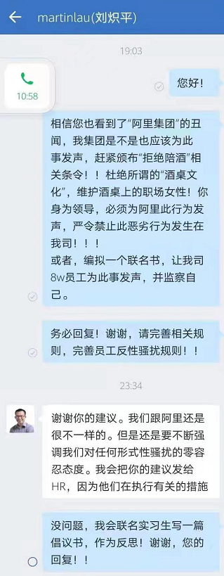 8月10日消息,网传腾讯实习生给马化腾和腾讯总裁刘炽平发消息,要求颁布“拒绝陪酒”相关条令,杜绝所谓“酒桌文化”。腾讯总裁刘炽平回复称,我们和阿里不一样,腾讯对任何形式的性骚扰持零容忍态度。