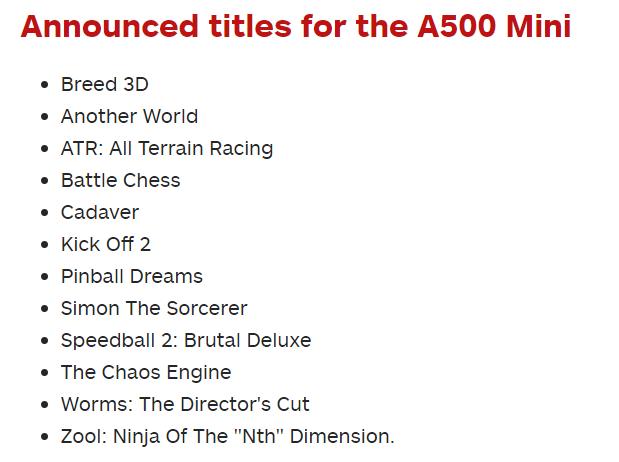 A500 Mini 配备了一款正宗的双键鼠标,并为希望获得手柄支持的用户提供了一个 8 键手柄。这款复古游戏机将附带额外的端口,让粉丝可以插入独立的外部标准 PC 键盘,以获得额外的功能,并附带游戏内保存和暂停功能,以帮助玩家完通关每一款经典游戏。