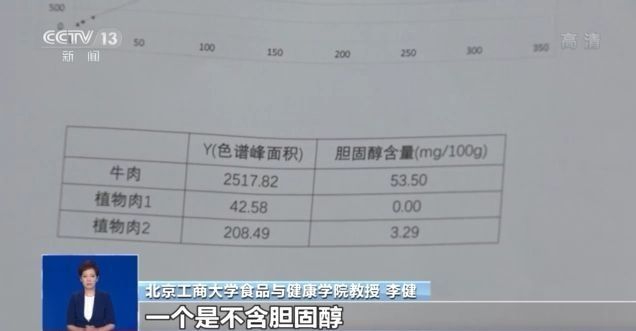 现在结果已经出来了,峰面积越大,代表胆固醇含量越高。我们前期做了一个标准曲线,把峰面积和含量对应上了。可以看出牛肉中的胆固醇含量是53.50毫克每100克,两款“植物肉”中,一个是不含胆固醇,一个含胆固醇是3.29毫克每100克,可以说“植物肉”和动物肉相比来说,是几乎不含胆固醇或含极少胆固醇的。