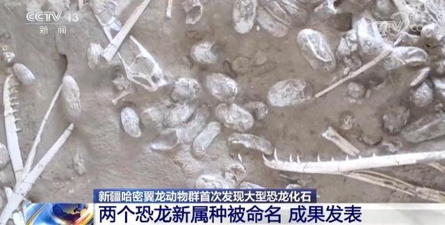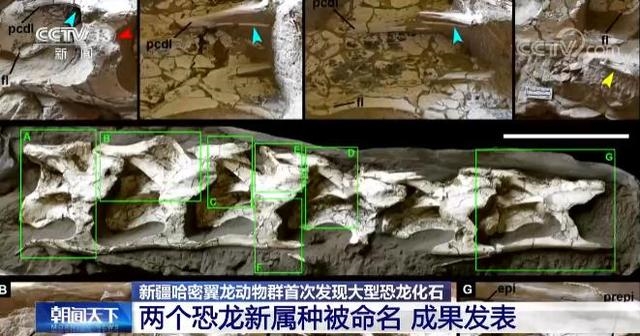 这次发现的3件恐龙化石都属于蜥脚类的多孔椎龙类,化石均不完整,分别保存了一段颈椎、一段尾椎和一段荐椎,另外还有一枚与尾椎保存在一起的兽脚类恐龙的牙齿。科研团队依据颈椎特征建立了盘足龙类一新属新种:中国丝路巨龙;依据尾椎特征建立了巨龙类一新属新种:新疆哈密巨龙。
