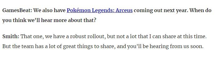 宝可梦公司国际集团的消费者营销高级总监JC Smith在采访中表示:一个“强力的宣发”正在路上,更多《宝可梦传说:阿尔宙斯》的消息即将释出。今年年底《宝可梦:晶灿钻石/明亮珍珠》将会发售,任天堂可能会将《宝可梦:晶灿钻石/明亮珍珠》和《宝可梦传说:阿尔宙斯》的新消息一起放出。