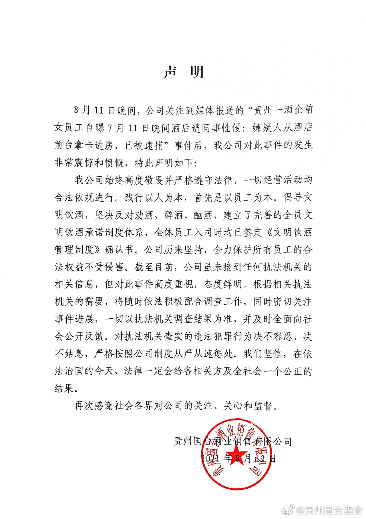 8月12日,话题“贵州国台酒业女员工自曝酒后被性侵”登上微博热搜,涉事公司为贵州国台酒业股份有限公司全资子公司。针对此事,今日,贵州国台酒业发布声明回应。声明称,8月11日晚间,公司关注到媒体报道的“贵州一酒企前女员工自曝7月11日晚间酒后遭同事性侵:嫌疑人从酒店前台拿卡进房,已被逮捕”事件后,公司对此事件的发生非常震惊和愤慨。