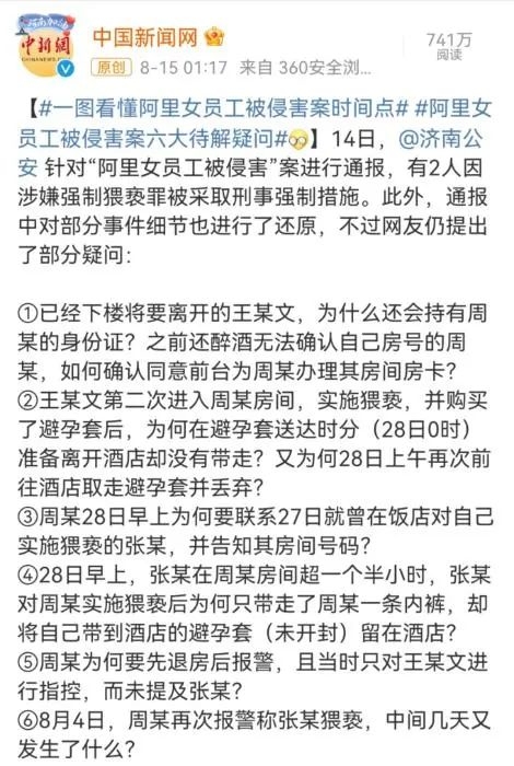 14日,@济南公安 针对“阿里女员工被侵害”案进行通报:有2人因涉嫌强制猥亵罪被采取刑事强制措施。此次通报对部分事件细节进行了还原。但同时,有网友发现,一些通报内容与此前女员工的爆料内容不完全一致,并疑惑:女方为何主动联系客户张某来房间?女方爆料与警方通报关于避孕套和内裤的说法不一,是否影响犯罪本身?