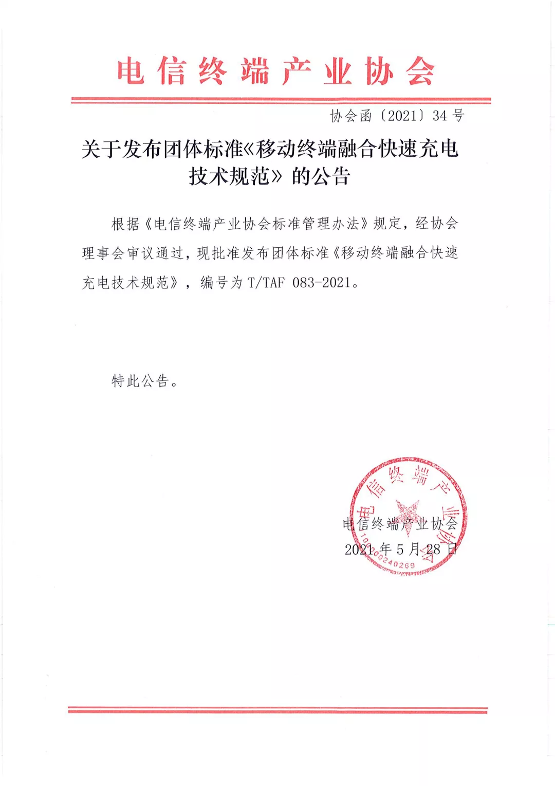 2021年5月28日,电信终端产业协会发布融合快充标准《移动终端融合快速充电技术规范》。该标准旨在解决目前市面上快充标准复杂多变、互不兼容的问题,同时也对提升用户的使用体验,节能环保起到积极的推动作用。