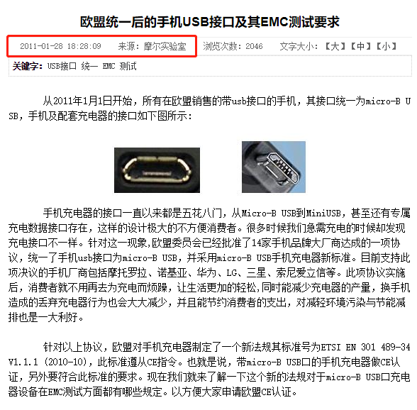 通过查阅以往的报道,我们找到了十年前的一篇文章《欧盟统一后的手机USB接口及其EMC测试要求》。从2011年1月1日开始,所有在欧盟销售的带USB接口的手机,其接口统一为MicroUSB,手机及配套充电器的接口如图所示。