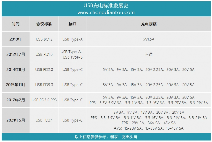 2021年5月25日,USB-IF协会推出了最新快充标准USB PD3.1。根据USB-IF协会公布的资料显示,在扩展功率范围EPR中,新增了28V、36V和48V三种固定电压档和三种可调电压档(Adjustable Voltage Supply,简称AVS)。