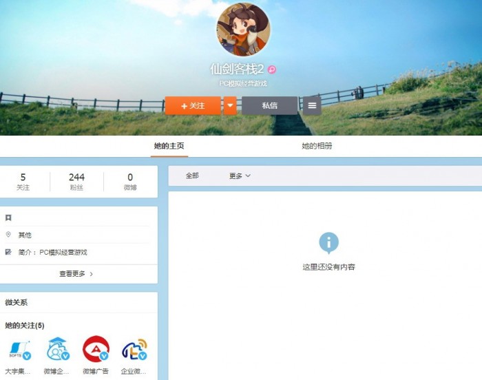 但目前没有认证信息,也没有任何内容发布。在其关注列表中有“大宇集團官方微博”,虽然不能确认这是仙剑官方注册的账号。但有眼尖的网友发现姚仙已关注该账号,许多人开始猜测《仙剑客栈2》要来了?