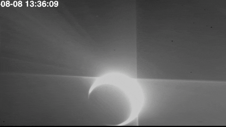 太阳轨道飞行器的SoloHI成像仪在金星接近地球前几天观测到了金星的夜侧。SoloHI则通常能通过捕捉被风中的电子散射的光来拍摄太阳风的图像。太阳风是太阳不断释放出的带电粒子流。在飞掠金星之前的日子里,该望远镜捕捉到了金星日面引人注目的眩光。下图展示了金星从左面穿过视野的情景,太阳在右上方的镜头外。这颗行星的夜侧是被太阳隐藏的部分,它看起来像一个被明亮的新月光包围的黑暗半圆。