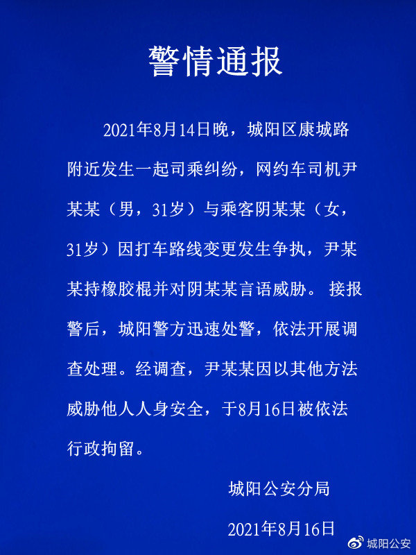 8月17日早间消息,青岛市公安局城阳分局官方微博@城阳公安发布警情通报。通报称,14日晚,城阳区康城路附近发生一起司乘纠纷,网约车司机尹某某与乘客阴某某因打车路线变更发生争执,尹某某持橡胶棍并对阴某某言语威胁。接报警后,城阳警方迅速处警,依法开展调查处理。经调查,尹某某因以其他方法威胁他人人身安全,于8月16日被依法行政拘留。