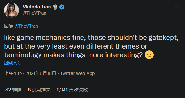 他并不是唯一一位因《堡垒之夜》的行为而发泄不满的 Innersloth 员工。《我们之中》的社区主管Victoria Tran也表示对Epic所做的事情“感到伤心”。她发表推文说道:“如果能合作真的会非常酷。(现在)只是伤心的独立(游戏人)时间。游戏机制无所谓,毕竟这些不应该被约束,但是至少使用不同的主题或者术语让模式变得更新颖有趣一点(不行吗)?”