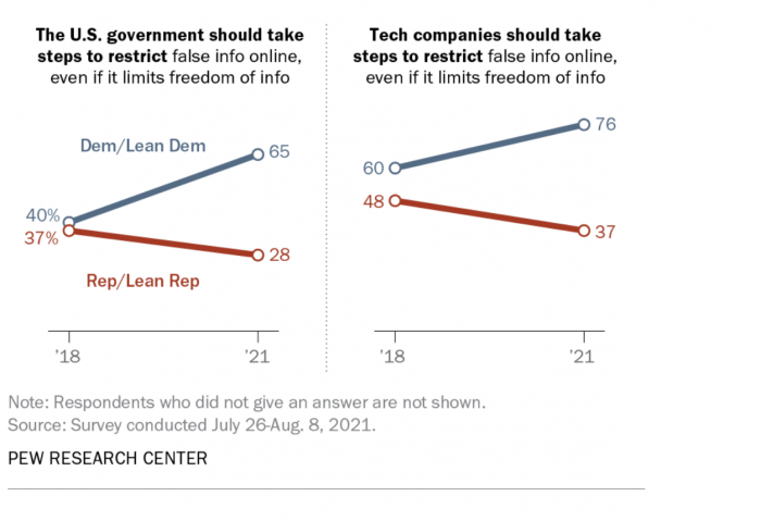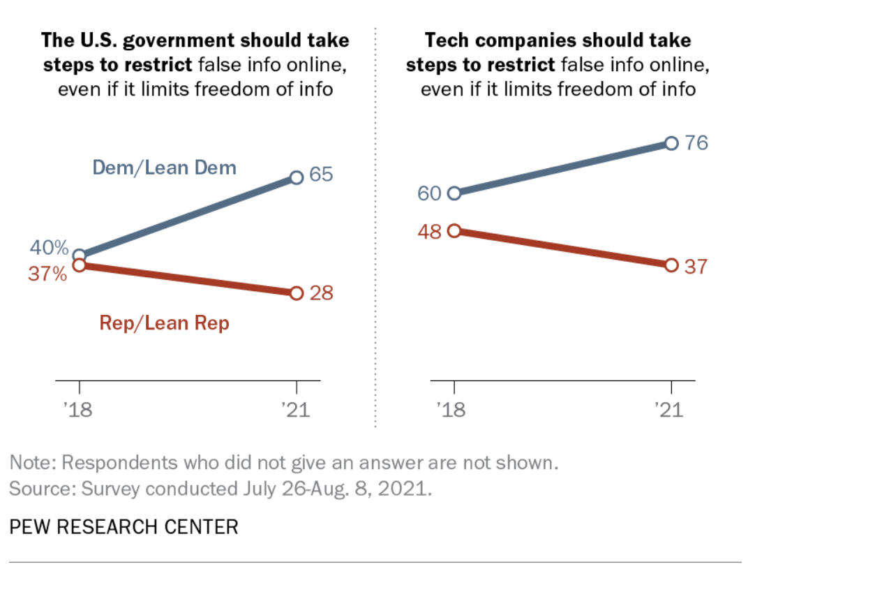 调查也显示,在政府、科技公司在限制错误信息方面的作用上,党派分歧扩大了。自2018年以来,关于政府解决在线错误信息方面的作用,出现了党派分歧。三年前,每个党派联盟中约有60%的共和党人和倾向于共和党的独立人士以及57%的民主党人和倾向于民主党的人,同意信息自由应优先于政府采取措施限制网上虚假信息。今天,70%的共和党人说这些自由应该得到保护,即使这意味着一些虚假信息的发布。而几乎同样多的民主党人(65%)认为政府应该采取措施限制虚假信息,即使这意味着限制信息自由。