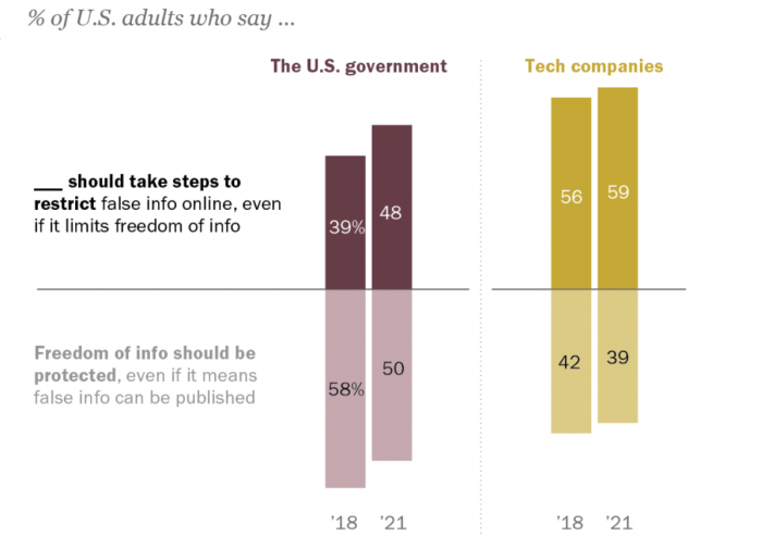 柱状图显示,美国人在政府是否应该采取措施限制网上虚假信息的问题上目前存在分歧,大多数人继续认为科技公司应该这样做。根据皮尤研究中心2021年7月26日至8月8日对11178名成年人进行的调查,大约近一半的美国成年人(48%)现在说政府应该采取措施限制虚假信息,即使这意味着失去一些获取和发布内容的自由,这比2018年的39%有所上升。与此同时,认为应该保护信息自由的成年人比例从58%下降到50%。