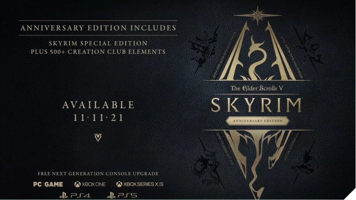 B社还宣布《上古卷轴5:天际 特别版》(也就是重制版)也会在同一天(11.11)获得次世代升级,玩家不需要拥有周年版也能在次世代主机上体验《上古卷轴5》。