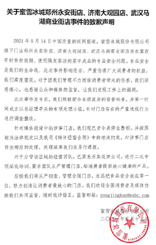 本网5月份进行曝光后,各地市场监管部门迅速行动起来,郑州35家蜜雪冰城门店被责令限期整改。同时,食品安全领域掀起了一股巡查以“蜜雪冰城”为主的、针对网红茶饮的执法风暴。蜜雪冰城发布道歉声明,进行整改。