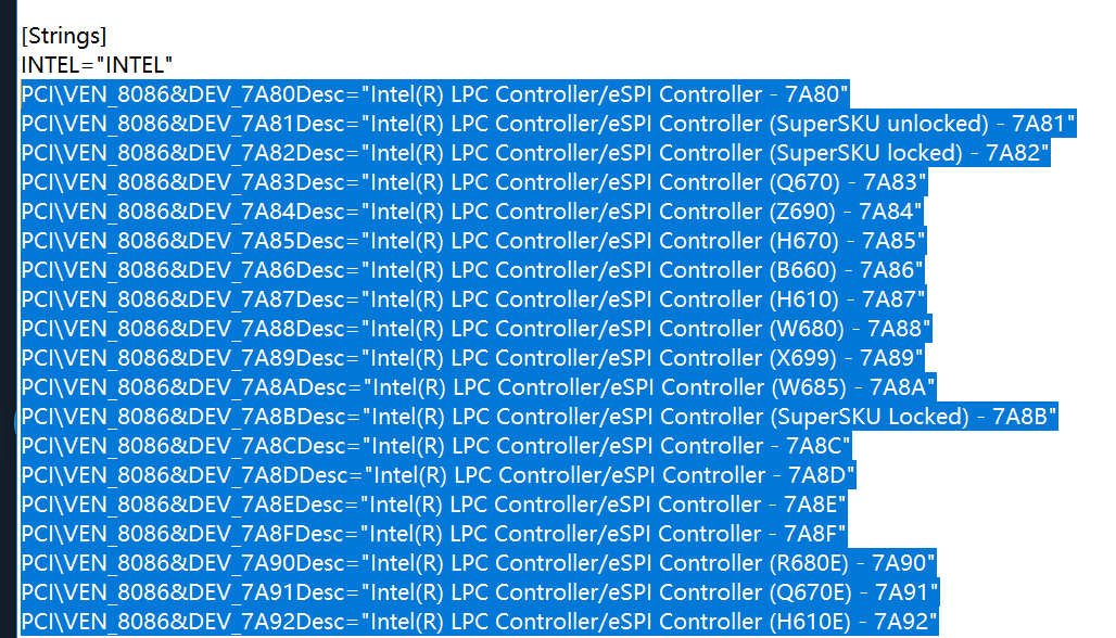 HXL(@9550pro)在 Twitter 上分享了一张截图,揭示了 10.1.18836.8283 版本的英特尔芯片组驱动程序中包含的 19 个 PCH 设备 ID 。