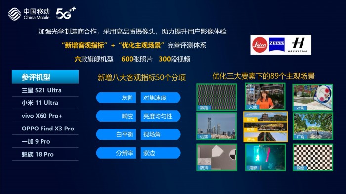 为给关心手机摄像头性能的用户提供技术指南及参考,本次中国移动针对6款市场热门高端旗舰机型的拍照及视频拍摄表现分别进行评测,前期共拍摄了600张照片、300段视频。评测过程中,团队设置了13大典型主观拍摄场景(如夜景、变焦、广角、人像、微距等)下的89个细分场景,以及8大客观指标维度(如灰阶、白平衡、分辨率、边缘畸变等)50个分项,便于对手机的摄像能力进行全面综合评测及排名。