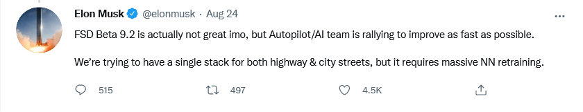 事实上,埃隆·马斯克也评价称FSD 9.2测试版“不太好”: