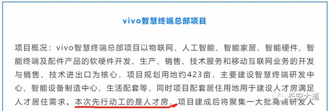 据公开资料显示,本次先行动工的,只是vivo人才房。该项目为vivo智慧终端总部项目,项目规划用地约423亩,主要建设智慧终端研发中心、智能设备制造中心、生活配套等。本次先行动工的是人才房,项目建成后将聚集一大批高端研发人才。尤为值得一提的是,带精装修海景房才卖1.2万/㎡。而附近小区“长安地王”二手房住宅价格已经突破了4.5万/㎡。